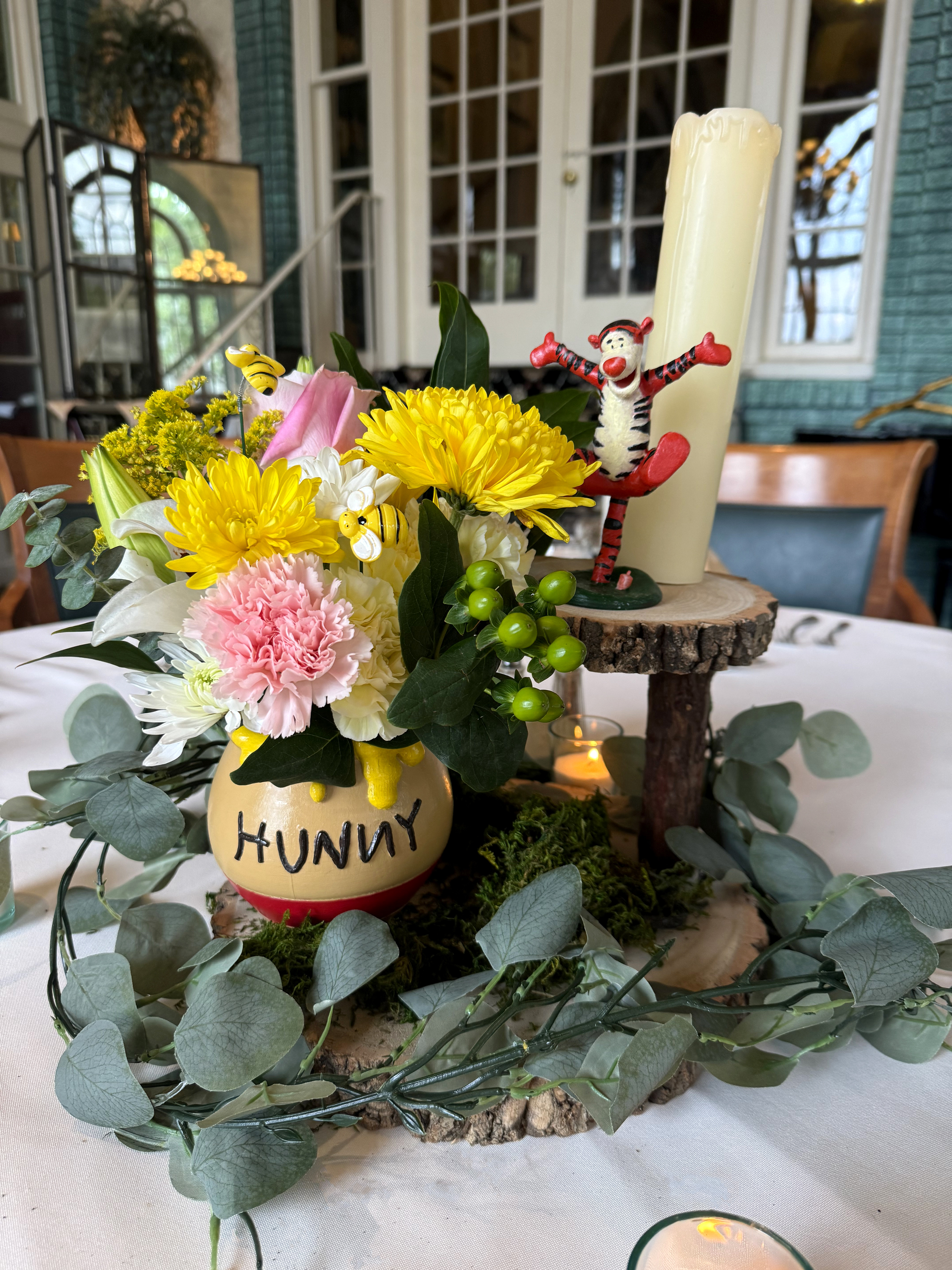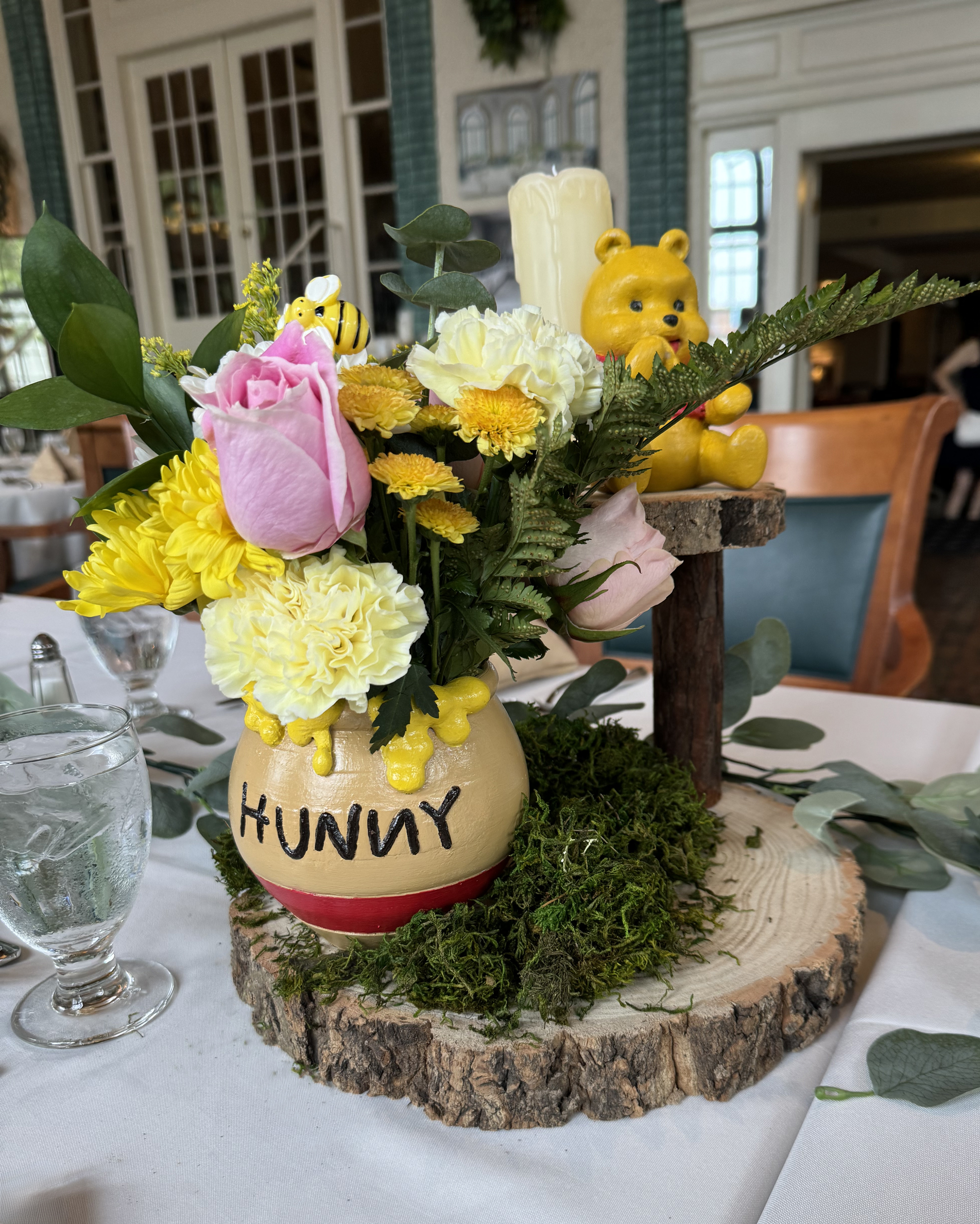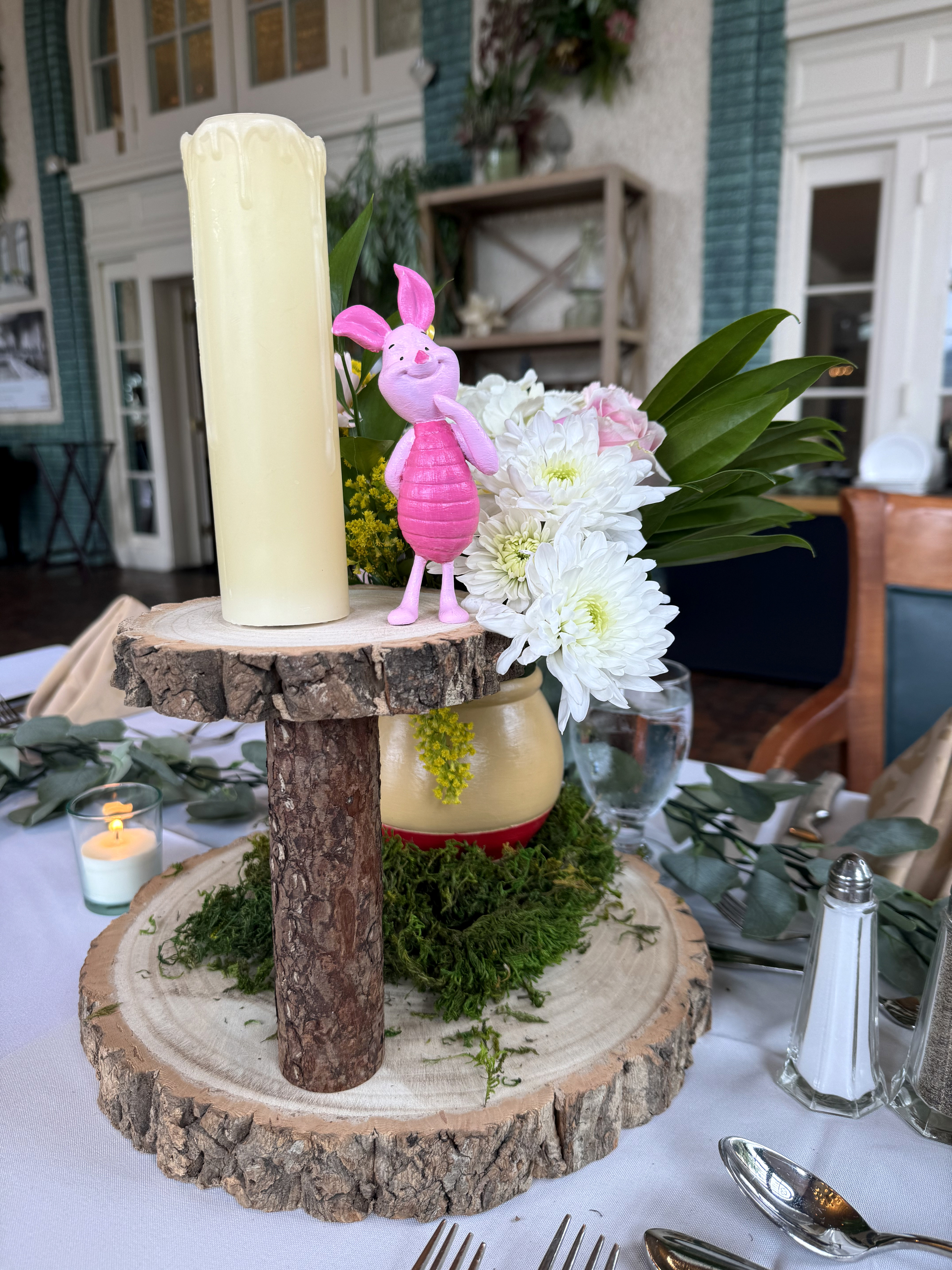 Centerpieces for Hundred Acre wood themed baby shower. Characters and Hunny Pots were 3D printed and post-processed by me as well as arranged and curated with the rest of the decor.