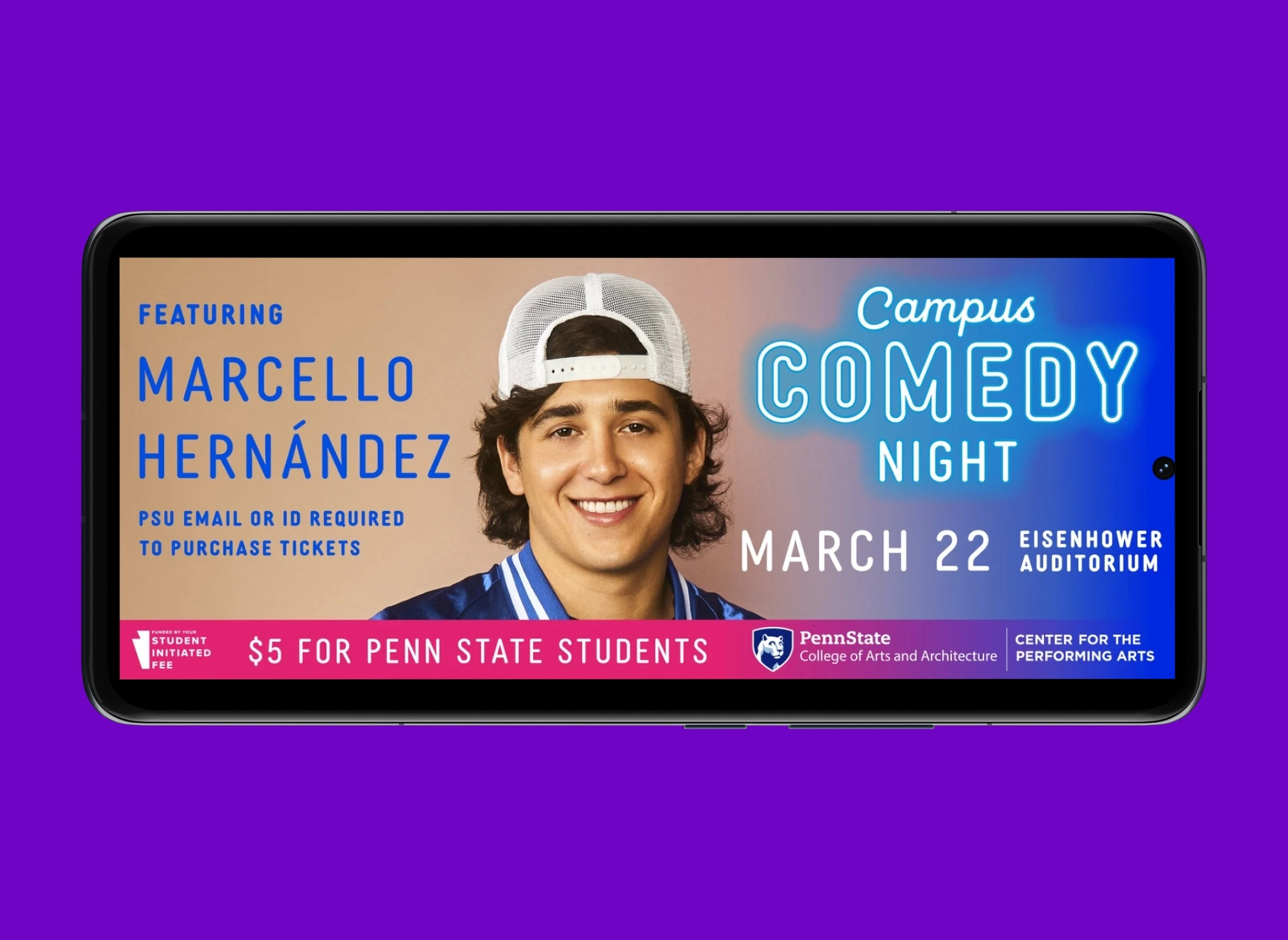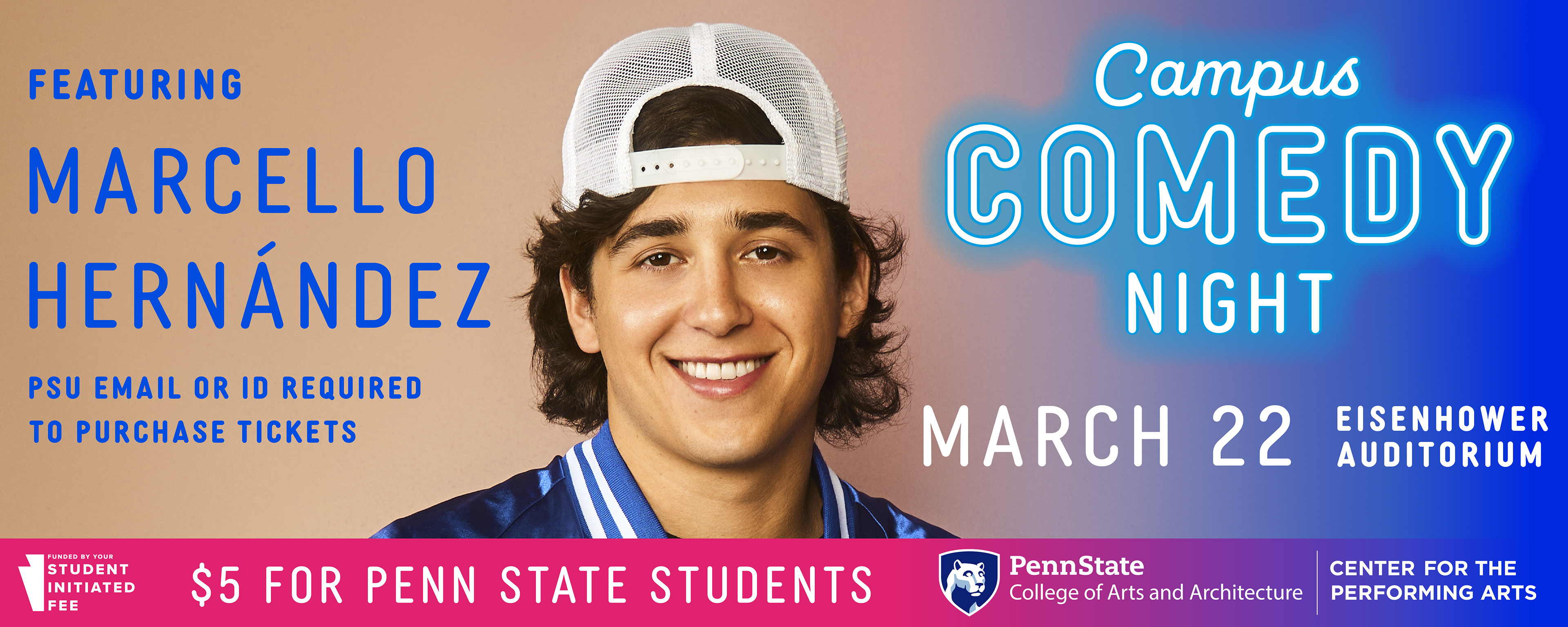 Digital banner created to advertise campus comedy night 2024 featuring Marcello Hernandez.