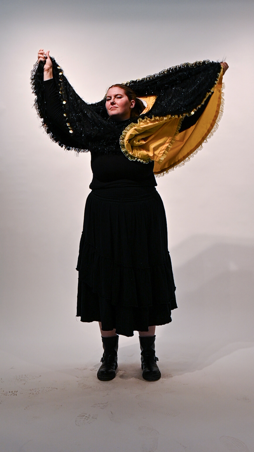 Parangole machine sewed, channels and bias tape create for edges, metal coins added to edges to create sound while in action.