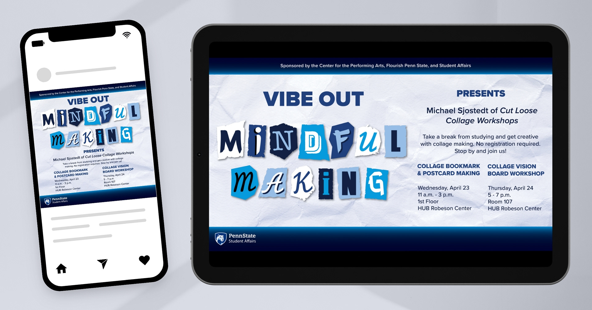 Digital materials created to advertise the Vibe out Mindful Making Collage Workshops for Penn State Student Affairs, Flourish PSU, and the Center for the Performing Arts.