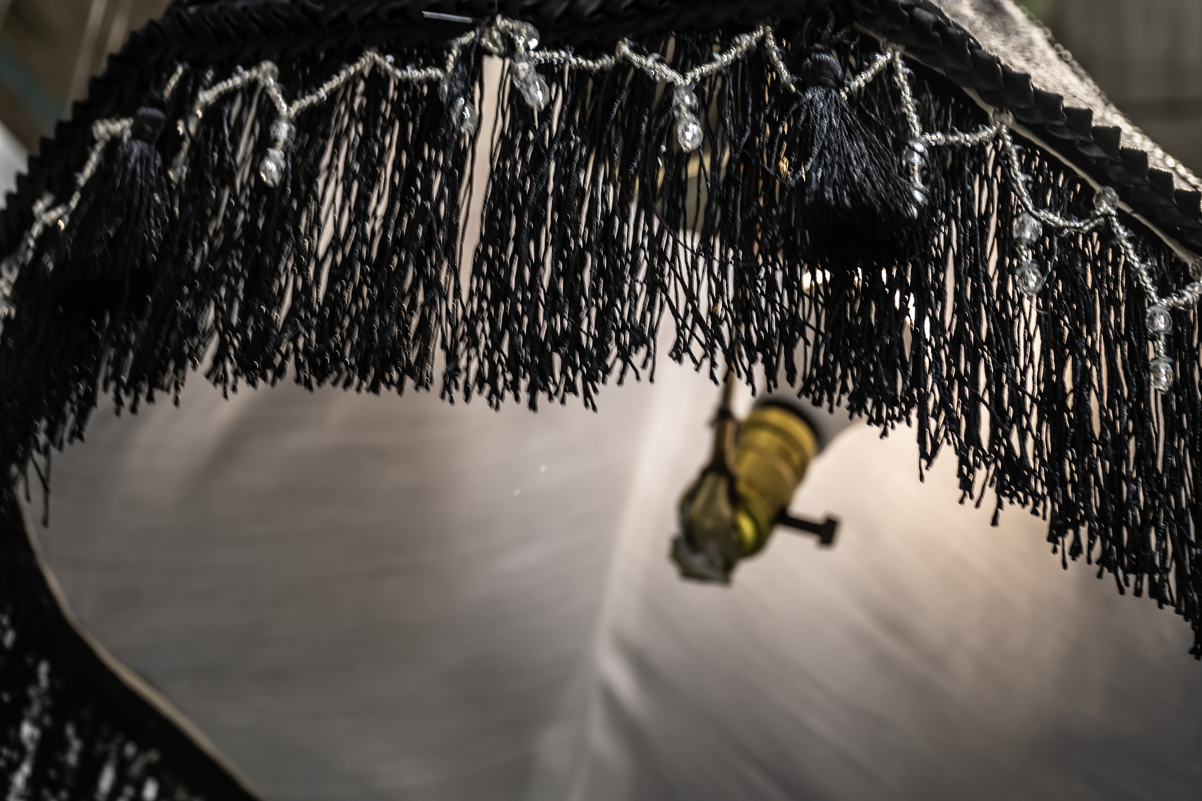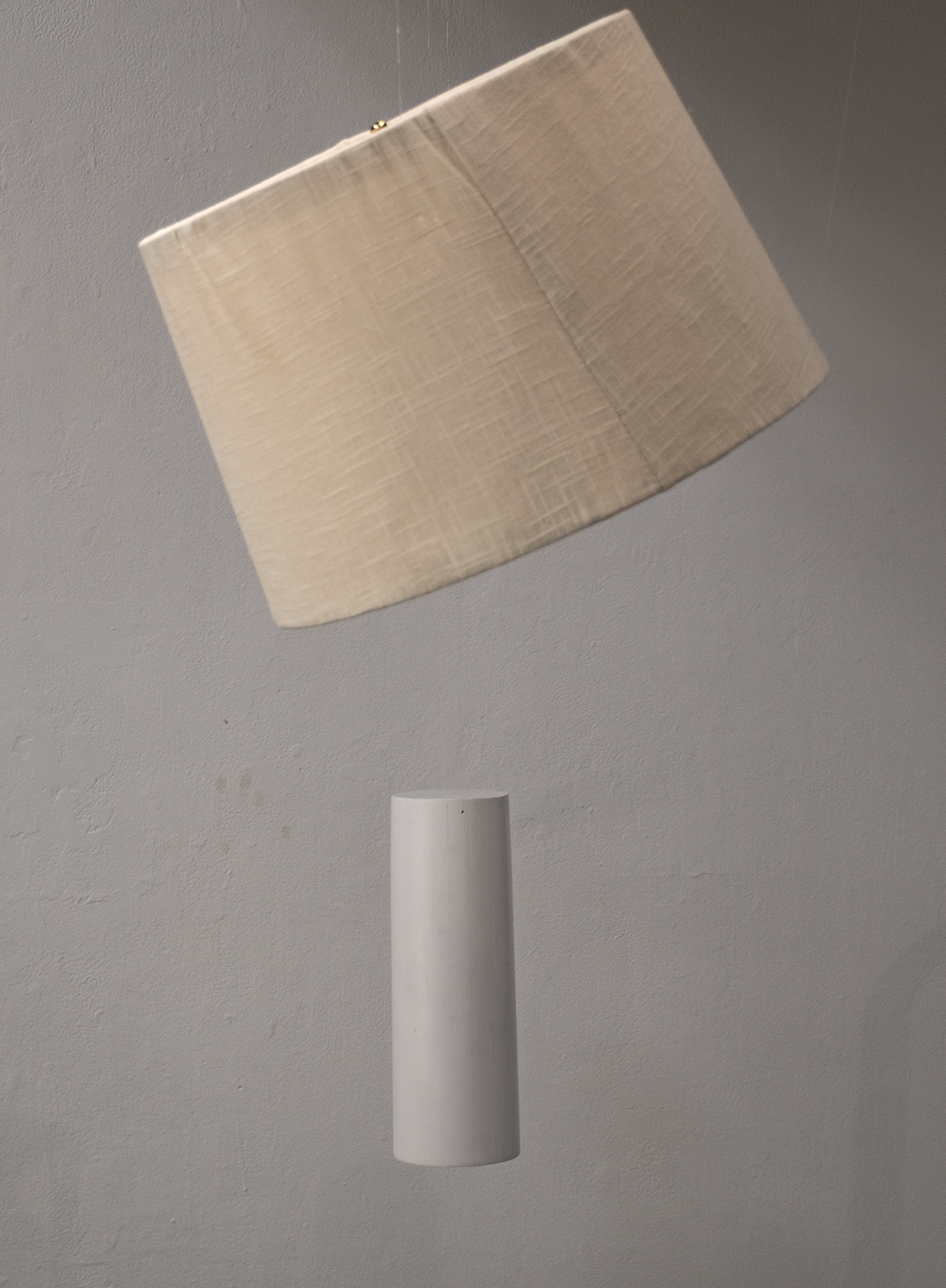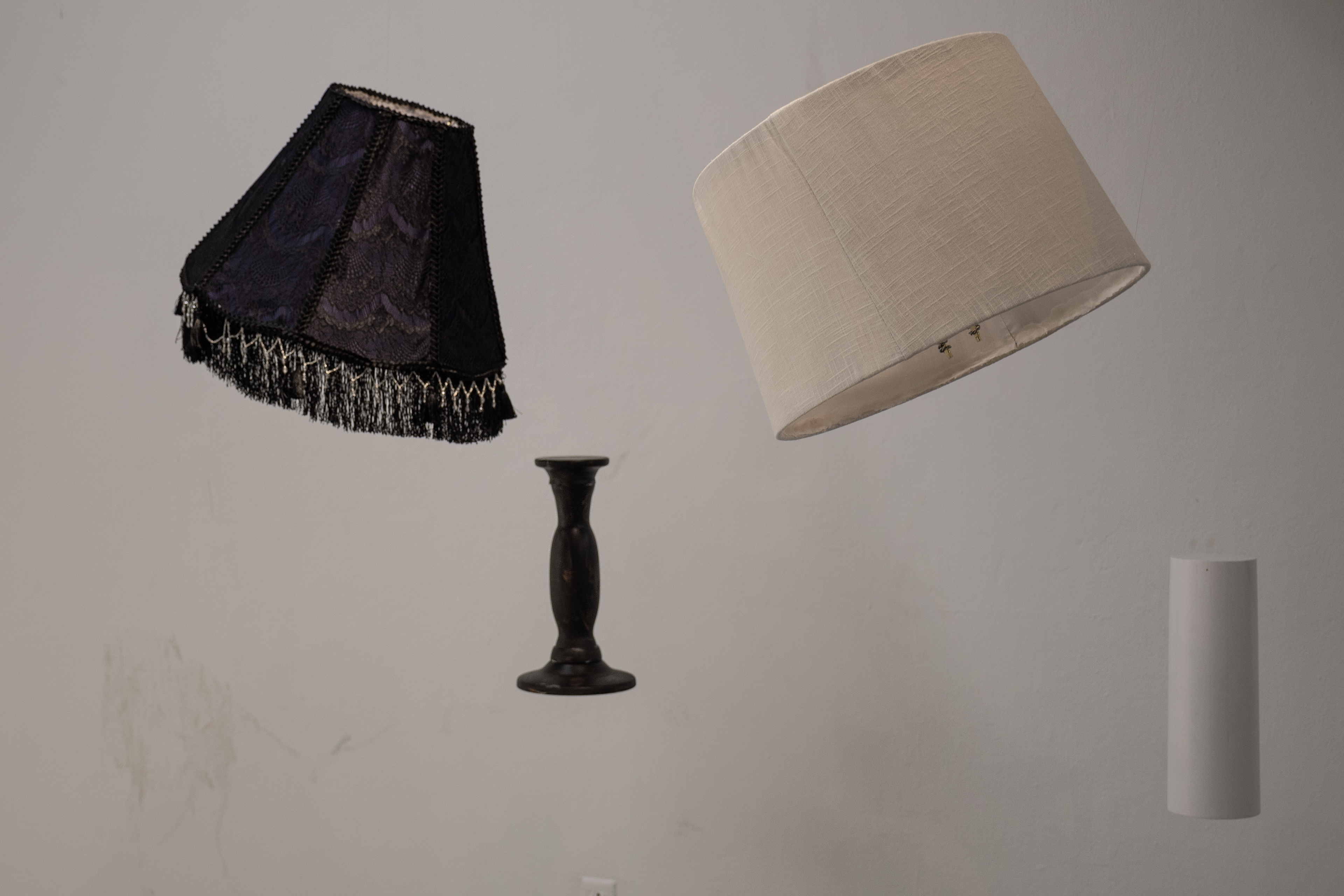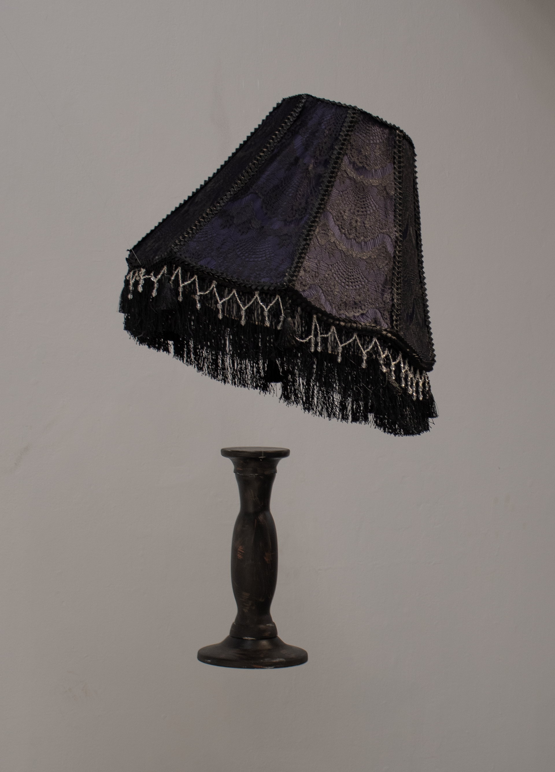 Fabricated out of pylar wood, metal, and fabric. "What's in the Gap?" represents a gap in time as well as space. The lampshades and their respective bases represent how things change over time.